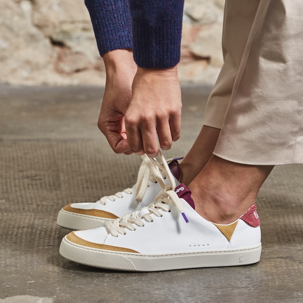 person wearing a Pair of white mid-ankle barefoot sneakers with pink accents