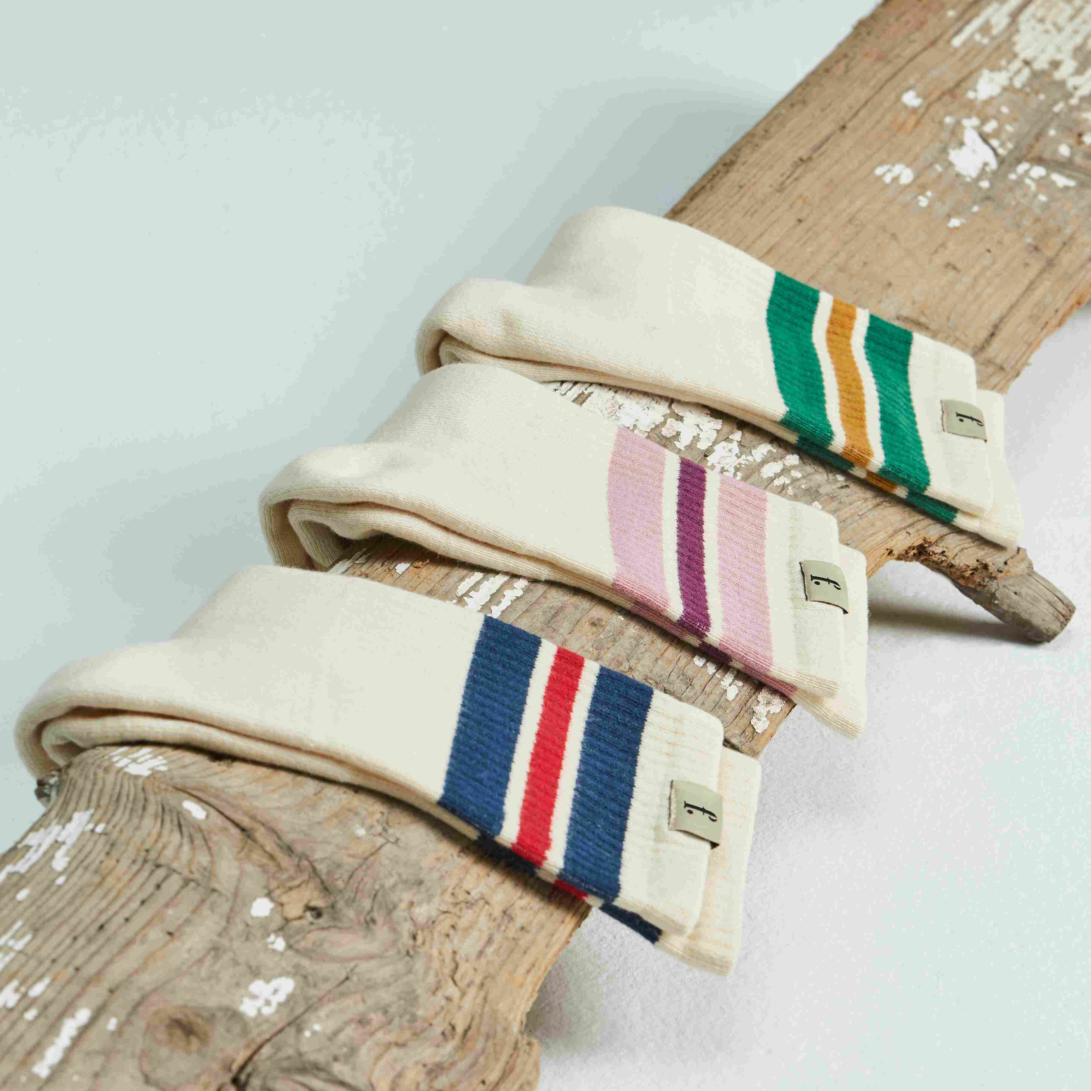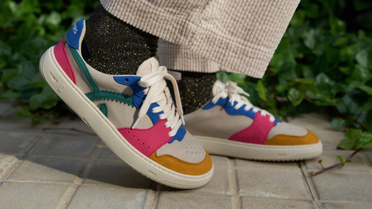 Colorful sneakers with a beige, blue, pink, and yellow design on a light gray background